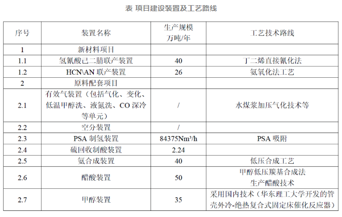根據環評文件(jiàn),公司將投資137.9億,新建40 萬噸/年己二腈、26 萬噸/年丙烯腈、28 億(yì)標方/年国产精品免费福利氣、35 萬噸/年甲醇、50 萬噸/年醋(cù)酸、6.75 億Nm³/年氫氣、13 萬Nm³/小時氧氣空分裝置及其他配套公用(yòng)和環保工程。