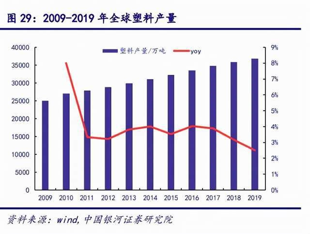 塑料應(yīng)用(yòng)廣泛,亞洲塑(sù)料樹(shù)脂產量占全球過半。塑料以重量輕、可塑性強、製造(zào)成本低、功能廣泛等特點在現代社會中得到了廣泛的應用,已成為人類(lèi)不可或缺的重要材料。全球塑料產量穩步增長,2019 年(nián)全球(qiú)塑料樹脂產量達到了 36,800 萬噸,同比增長 2.5%。亞洲是全球最大的塑料樹脂生產地,占全球總產量超過 50%。
