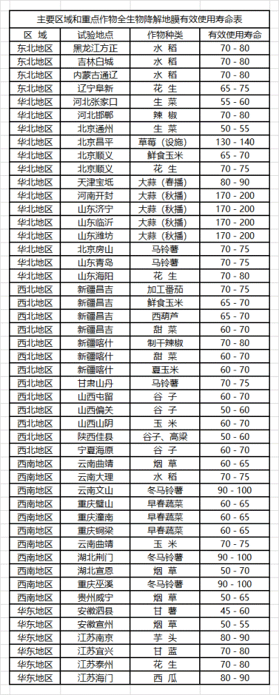 主要區域(yù)和重點作物全生(shēng)物降解地(dì)膜有效使用壽命表: