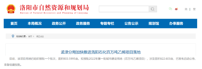 3月28日,洛陽市孟津區人民政府(fǔ)對中石(shí)化洛陽分公司百萬噸乙烯項目社會穩定(dìng)風險分析評估公示。