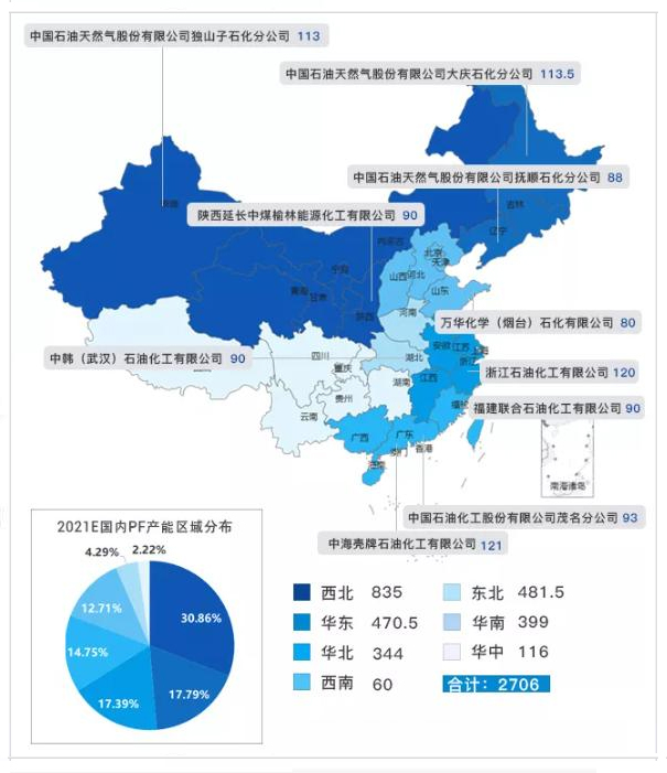 在大乙烯時代,企(qǐ)業多為(wéi)煉化一體化,湧現了浙江石化、煙台萬(wàn)華、恒力石(shí)化等地方企業,迅速(sù)擠占市場。從地域分布(bù)來看,聚(jù)乙烯生產企業(yè)仍集中在主要消費地華北、華東(dōng)、西北地區,地域內規模以上製品企業(yè)集中。從消(xiāo)費來看,像華北的農膜、管材(cái)、包(bāo)裝,華東的(de)管件、包裝、日用注塑中空等,考慮物流運輸、采購穩定性等因素,圍繞主要製品需求地,生產(chǎn)企業也較為(wéi)集中。聚乙烯本身屬於進口依存度較高的產品,刨除國內供(gòng)給,仍依托沿海青島、上海、寧波、黃埔等港(gǎng)口進(jìn)口來自中東等地資源。企業分布情況(kuàng)如下。