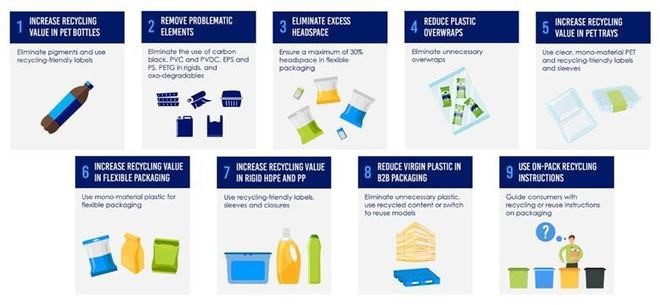 CGF(消費品論壇Consumer Goods Forum)於2021年7月發布了9條《黃金設(shè)計原則》指南細則,旨在加快(kuài)推進(jìn)“使用更少的塑料(liào)、更好(hǎo)的塑料”的進程,去除塑料在回收再生環節中(zhōng)的不利因素,實(shí)現塑料循環經濟,100%可回(huí)收再生。