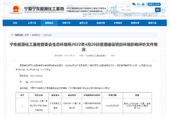 就在項目場地交付的當(dāng)天,寧東能源化工基地管委會生態環境局也對(duì)萬華化學(寧夏)有限公司30萬噸/年MDI分離項目進行環(huán)境(jìng)影響評價文件情況公示。
