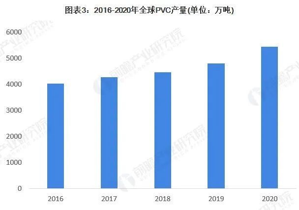 2016-2020年全球PVC產(chǎn)量總體呈上升趨勢。根據(jù)Bloomberg的統計,中國PVC產量占全球(qiú)產量(liàng)的42%,據此測(cè)算2020全球PVC產量為5431萬噸。
