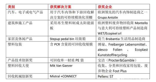今年歐洲塑料回收大(dà)獎獲獎名單如下:
