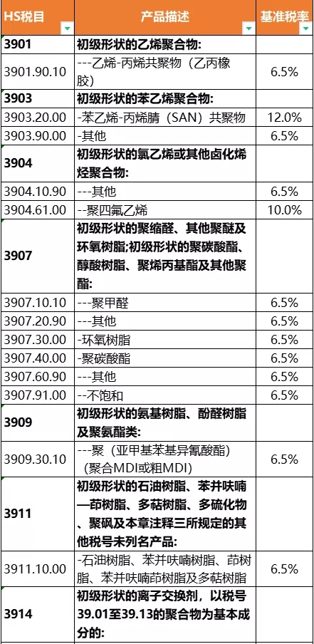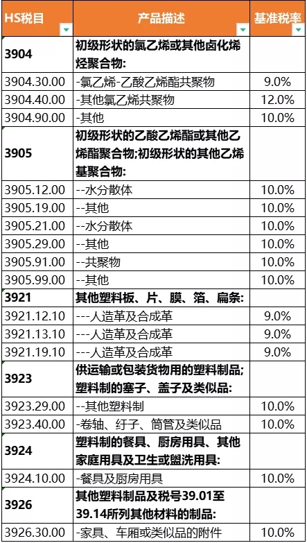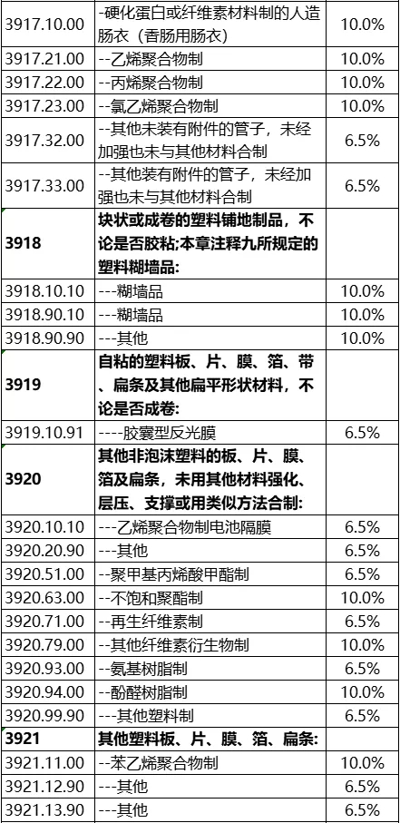 協定生效過渡期(qī)(第10年)關稅為零的塑料及(jí)其製品清單