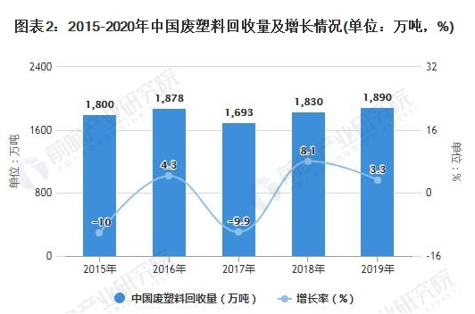 2015-2019年,我國廢塑(sù)料回收量整體呈增長趨勢。2019年,廢塑料回收量約1890萬噸,同比增長(zhǎng)3.3%,由於2019年我國塑料製品產量較(jiào)高,我國廢塑(sù)料回收比例較低,僅為23.09%。