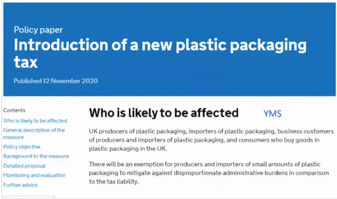 除了歐盟外,英國(guó)稅務與海關總署也於去年11月發布了一(yī)項新稅種,即塑料包裝稅(PPT),適用於在英國生產或進口到英國的塑料包裝。該決議已在2021年《財政法案》中得到了立法,將從2022年4月1日起生效。