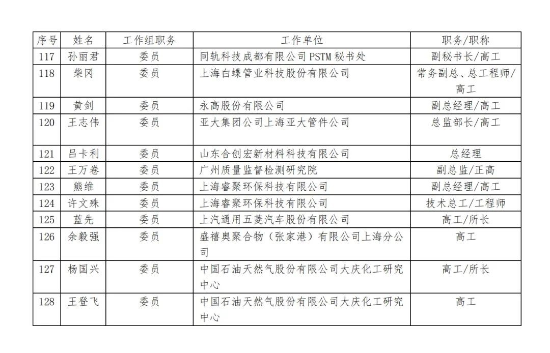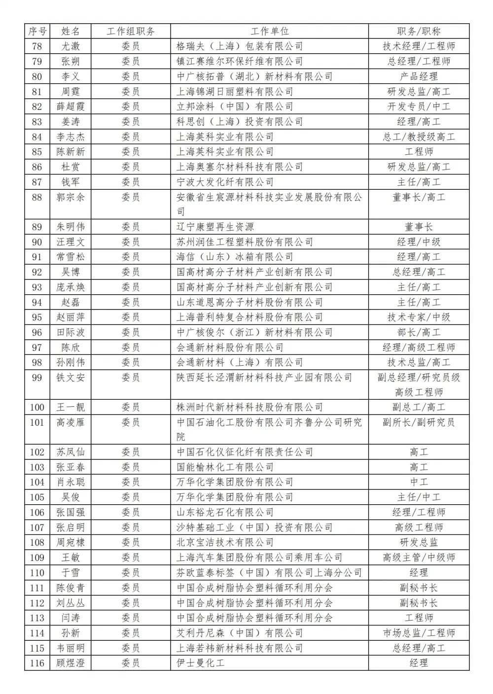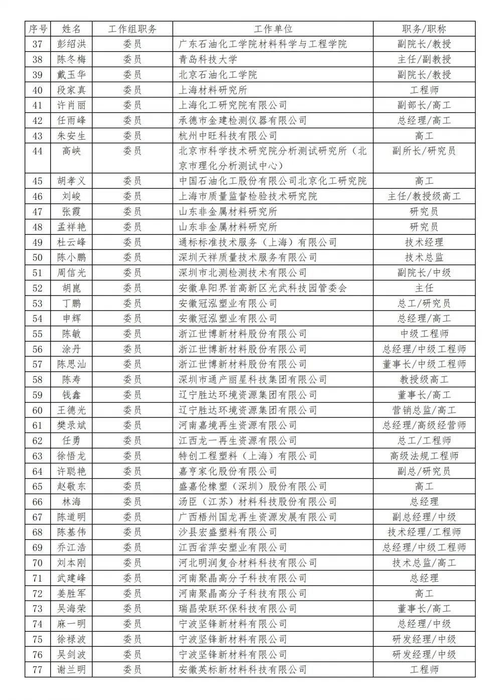 全國塑料標準化技術委員會再生塑料(liào)工作組(SAC/TC15/WG2)委員名單如(rú)下: