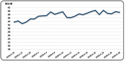 第四階段內石油價格逐漸走高。5月25日-6月30日WTI原油價格(gé)變化趨(qū)勢如下圖16所示。OPEC再度召開會議並決定重啟原油減產,油(yóu)價在5、6月(yuè)期間逐步回升。OPEC延長減產至7月底,且成員(yuán)國努力提高減產(chǎn)執行率,這無疑提(tí)振油價反彈。油價回(huí)暖也導致塑料原料價格的波動上漲,6月底臨沂塑料原料價格(gé)指數相(xiàng)較5月中旬上漲4.09%。
