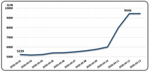 纖維料大肆狂漲帶動其它品(pǐn)種上調出廠價。4月上旬,山東地區丙烯市場價(jià)格在(zài)單日內曾普遍暴漲超(chāo)1000元/噸,漲幅達35.02%,部分(fèn)企業(yè)更是暴漲5000元/噸,漲幅已近100%。4月中上旬山東丙(bǐng)烯(xī)市場價(jià)格變化趨勢如圖17所示。