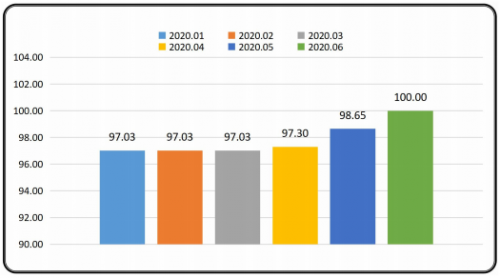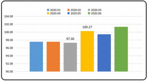“任你押”業務向塑料產業鏈客戶提供資金融通服務,為塑(sù)料市場企業緩解資金壓力提供可靠助力,對(duì)臨沂塑料市場商戶(hù)信(xìn)心指數在(zài)二季度的持(chí)續走高起到積極作用。3月(yuè)臨沂塑料(liào)市場(chǎng)商戶市場前景信心指(zhǐ)數收報於97.03點,處於不景氣區(qū)間,但二季度內(nèi)市(shì)場前景信心指數不斷上行,6月相較3月上(shàng)漲3.06%。市場前景信心(xīn)2020年上半年變(biàn)動趨勢如圖19所示。