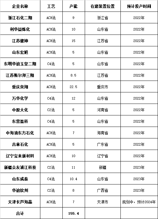 表1 2022-2025年中國MMA擬在建產能統計(萬噸/年)