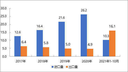 圖2 2017年-2021年1-10月中國MMA進出口量統計(萬噸)