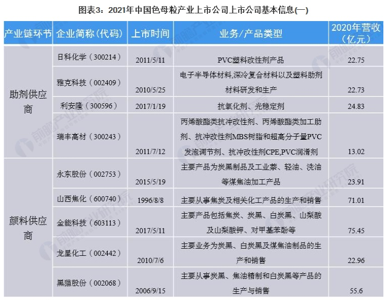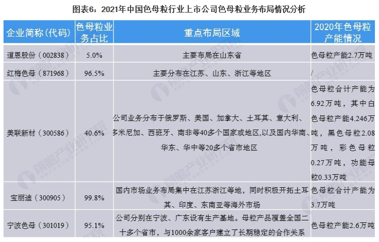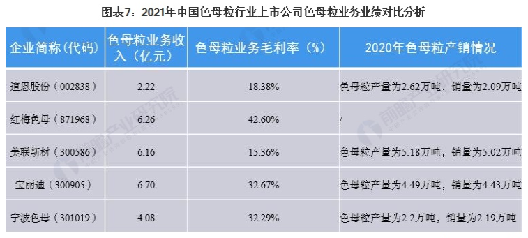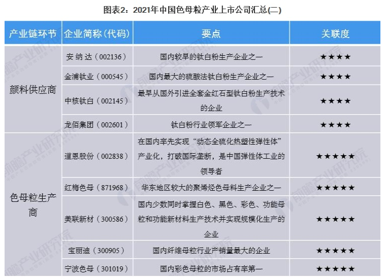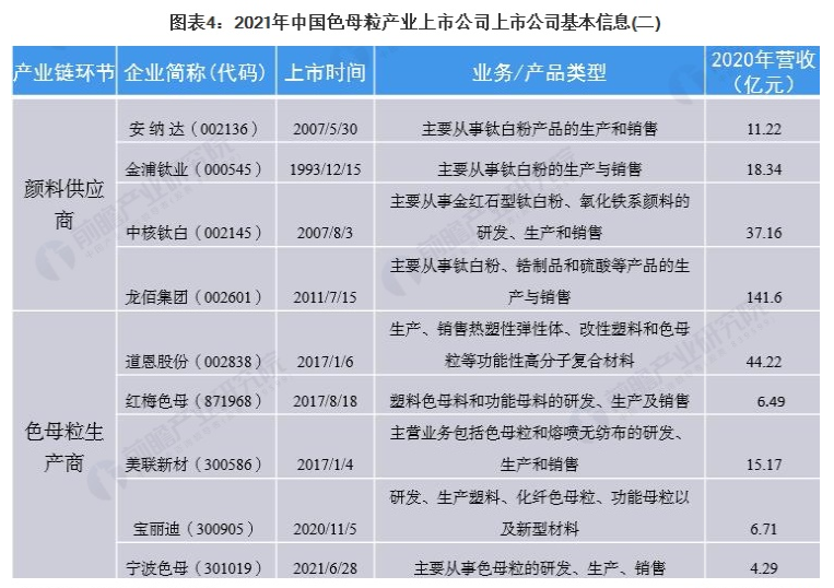 中遊色母粒生產製造上市企業有:道恩股份(002838)、紅梅色母(871968)、美聯新材(300586)、寶(bǎo)麗迪(300905)、寧波色母(301019)等。