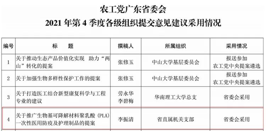 廣東省委會:采用(yòng)推廣PLA一次性醫用(yòng)防疫及護理製品的提案