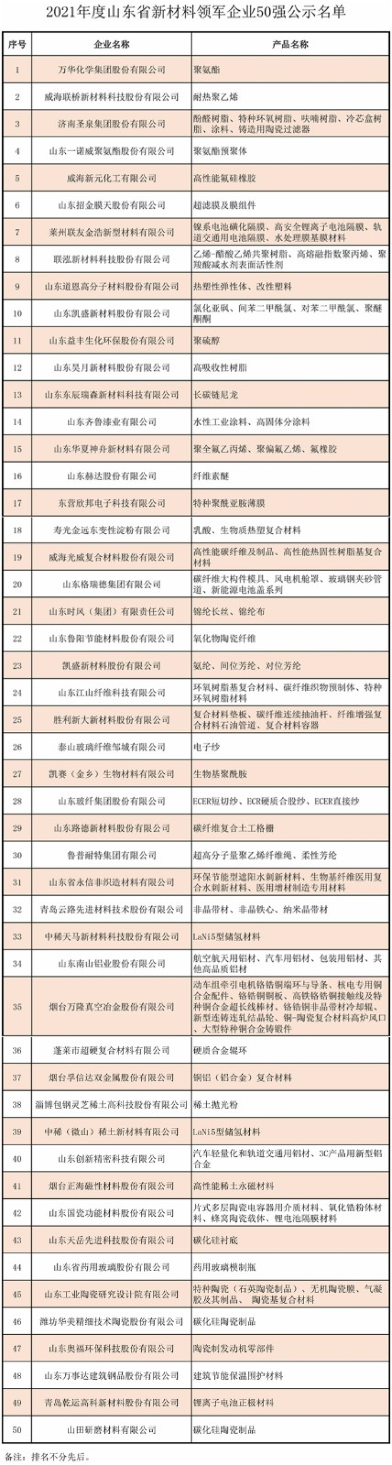 近(jìn)日,山東省工業(yè)和信息化廳(tīng)公示了(le)2021年度山東省新材料領軍企業培育庫入庫名單和2021年山東省(shěng)新材料領軍企業50強(qiáng)名單。
