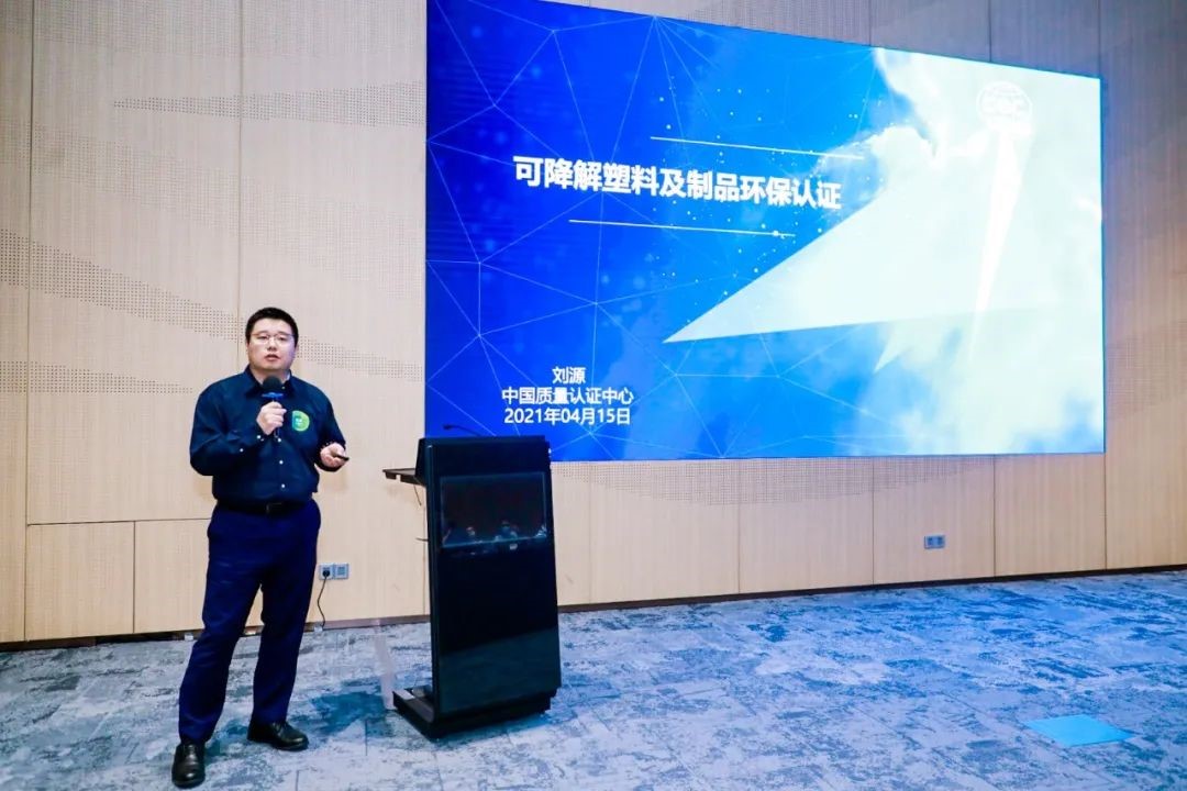 中國質量認證中心 產品六(liù)處市場部部(bù)長劉源作《可降解塑料製品認證流(liú)程(chéng)及要求》報告,劉源部長首先向大家簡要介紹了認證中心的機構情況,後就認證中心的環保認證方案進行了詳細(xì)介紹,如認證適用(yòng)範圍、認證模式、認證申(shēn)請、檢驗檢(jiǎn)測、工廠檢查和證書出具等。