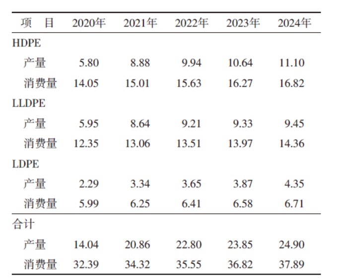 2020年,受年初突發新冠肺炎疫情的影響,終端消費市場的需求受到一定的抑製,但隨著國內複工複產,經濟(jì)生活有序恢複(fù),PE消費量仍會(huì)略微增長,預計2020年PE消費量約(yuē)為32.39 Mt,同比增長0.8%。其中(zhōng),HDPE為14.05 Mt,LLDPE為12.35Mt,LDPE為5.99 Mt。伴隨(suí)新冠肺炎疫情的有效控製,更大力度財稅政策(cè)的出台,以及擴大(dà)內需政策(cè)的穩步推進(jìn),2021年,我國(guó)經濟將實現較快發展,PE消費量也將增(zēng)至34.32 Mt。2022—2024年,PE消費量將(jiāng)保持年均3.3%的增長率。預計到2024年,我國(guó)PE消費(fèi)量(liàng)將達到37.89 Mt。其中,HDPE消費量為16.82 Mt,自給率(lǜ)約66.0%,消費缺口約5.70 Mt;LLDPE消費(fèi)量為14.36 Mt,自給(gěi)率約66.0%,仍有(yǒu)約4.90 Mt的消(xiāo)費(fèi)缺口;LDPE消