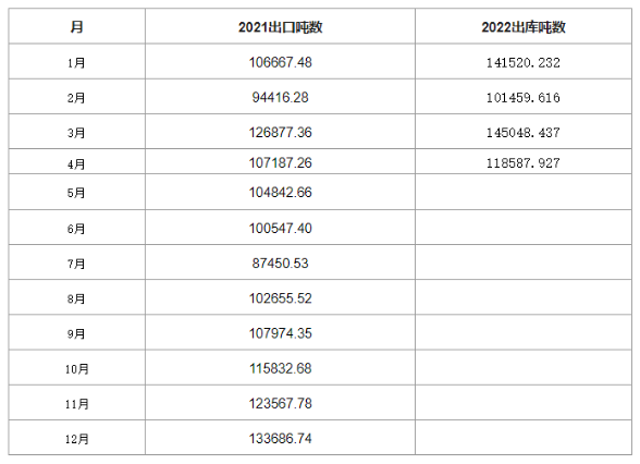 據海關數據顯示,2022年4月鈦白粉出口(kǒu)為11.86萬噸,環比減少18.24%,同(tóng)比則(zé)增長10.64%。2022年累計出口(kǒu)達50.66萬(wàn)噸(dūn),年(nián)度同比增加16.42%。