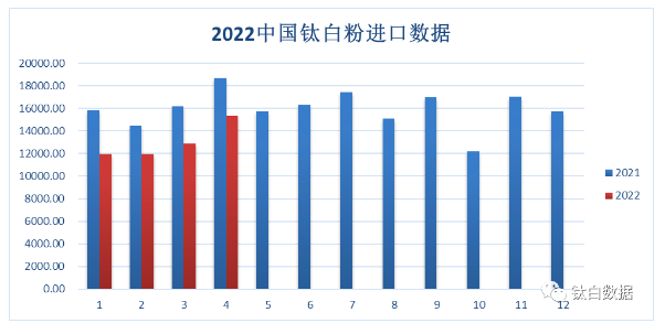 2022年4月(yuè)鈦白(bái)粉進(jìn)口為1.54萬噸,同比減少17.99%,環比增長19.42%。年累計進口5.21萬(wàn)噸,年度同(tóng)比減少20%。