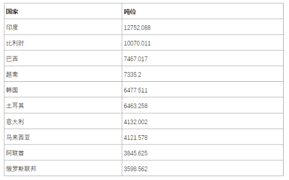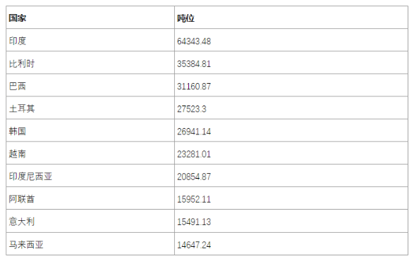在出口國家(jiā)地區上(shàng)麵,前三是印度、比利時和巴西,下表是年度出口(kǒu)前10國家(jiā):