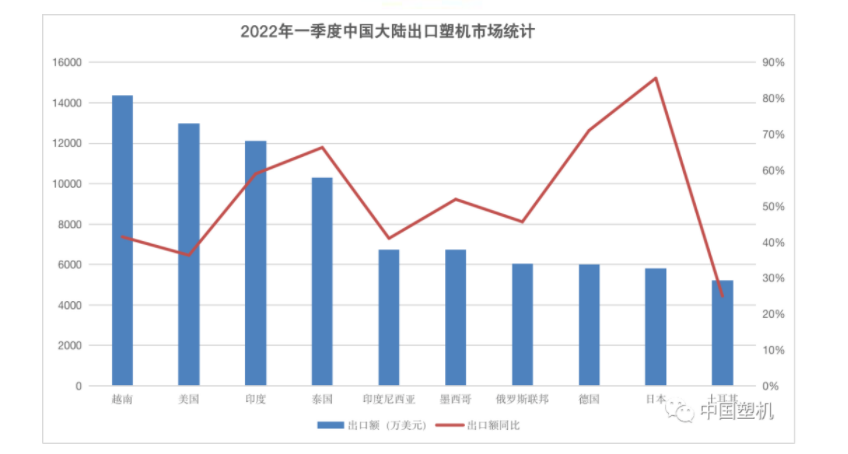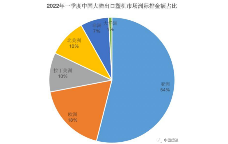 出口分布:從洲際看,2022年一季度中國(guó)大陸塑機出口至各大洲的金額全麵增長:至亞洲出口額(é)為8.9億美元,同比增長111%;至歐(ōu)洲出口額近3.0億美元,同比增長95%;出口至拉(lā)丁美洲(zhōu)和北美(měi)洲分別為1.7億美元和1.6億美元,分別同比增長67%、79%;出口至非(fēi)洲為1.2億美元,同比增長了53%。