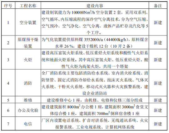 輔助工程包括空分裝置、原煤預幹燥裝置、火炬係統、消防、維修、辦公及化驗、電信等。