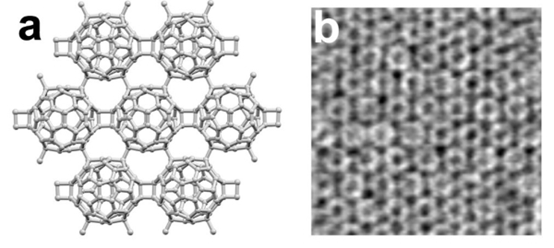 碳材料一直被認為是(shì)一種(zhǒng)未來材料,製備新型碳材料一直是材(cái)料領域的前沿科學問(wèn)題,以富勒烯、碳(tàn)納(nà)米管、石墨烯、石墨炔為代表的新型碳材(cái)料的(de)每一次發現都引發(fā)了材料學家的研究熱潮。單(dān)層聚(jù)合C60是一種全新的簇聚二維超結構,由 C60簇籠在平麵上通過C-C鍵相互共價鍵合形成規則的拓(tuò)撲結構(gòu)。這種新型碳材料具有較高的結晶(jīng)度和良好的熱力學穩定性,並具有適度的禁(jìn)帶寬度,為碳材料的研究提供(gòng)了全新思路。