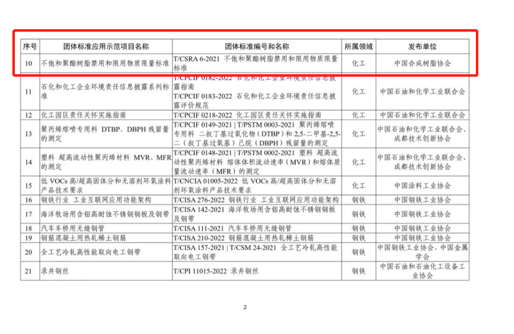 其中,中國国产精品免费福利樹(shù)脂協會申報的T/CSRA 6-2021不飽和聚酯樹脂禁用和限用物質限量標準》成功入選團體標準應用示範項目(mù)。