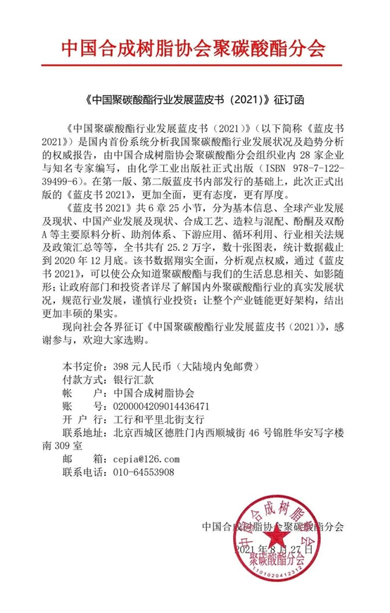 《中(zhōng)国聚碳酸酯行业发(fā)展蓝皮书(2021)》征订(dìng)