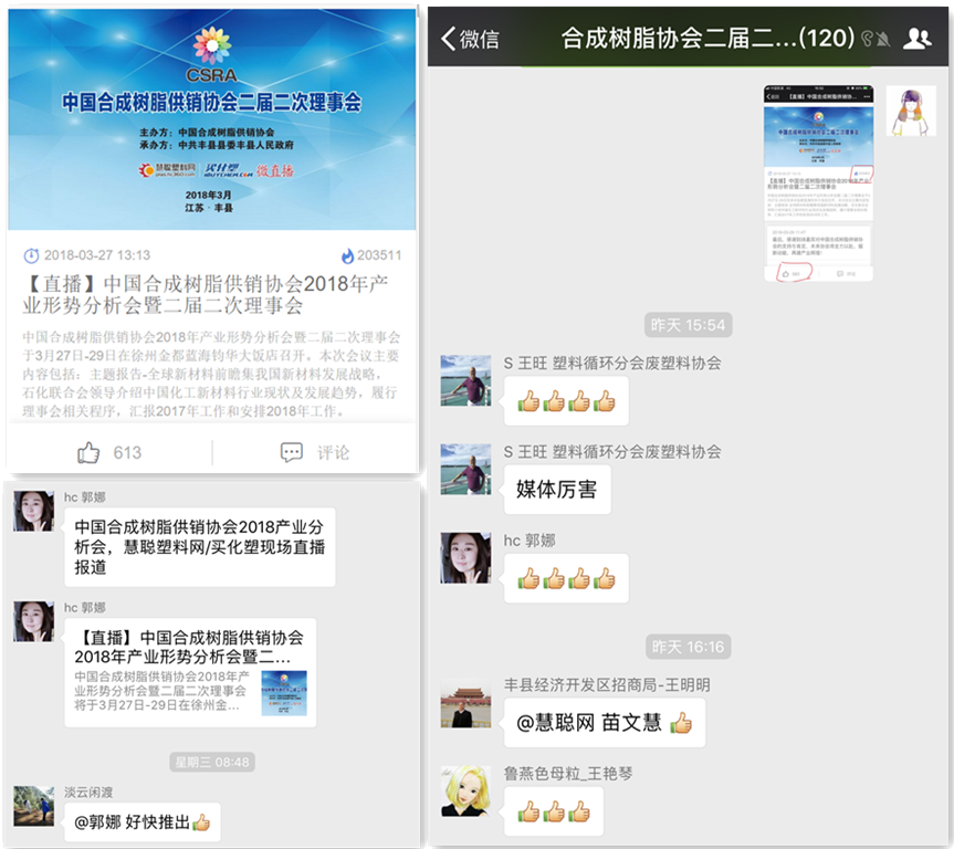 慧聪塑料网/买(mǎi)化塑作为中国国产精品免费福利树脂供销协会理事单位,也应邀出席本次会议(yì)。并以提高协(xié)会影(yǐng)响力为宗旨,对(duì)会议全程做现场微直播,累(lèi)计浏览量高达20余万,点赞600余(yú)人。